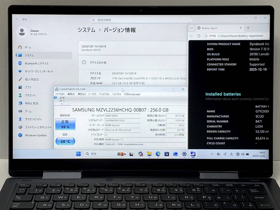 バッテリ充電可 OS残時間表示3時間45分~13時間41分 下記バッテリレポートをご参照ください。