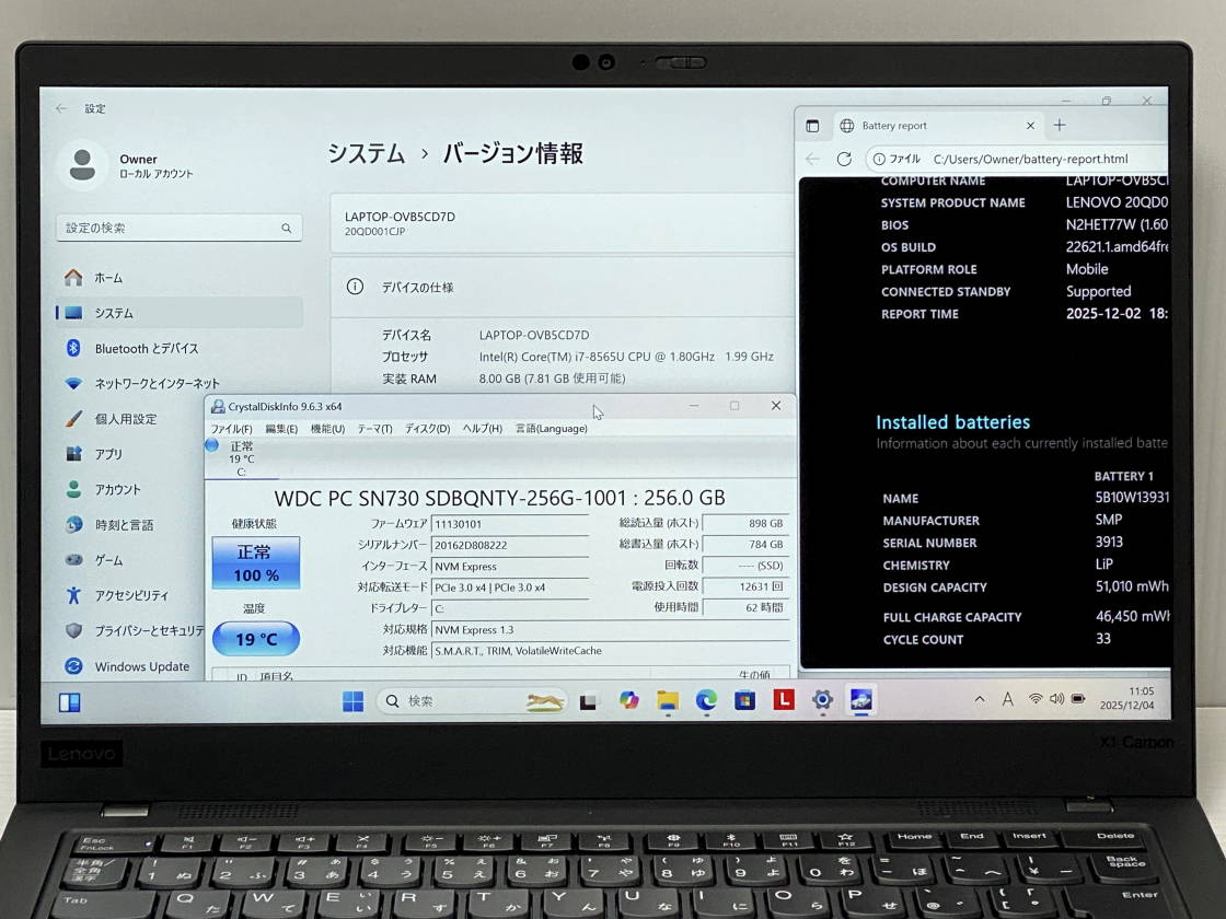 バッテリ充電可 OS表示時間3時069分~7時間11分 実測ではございませんので目安として