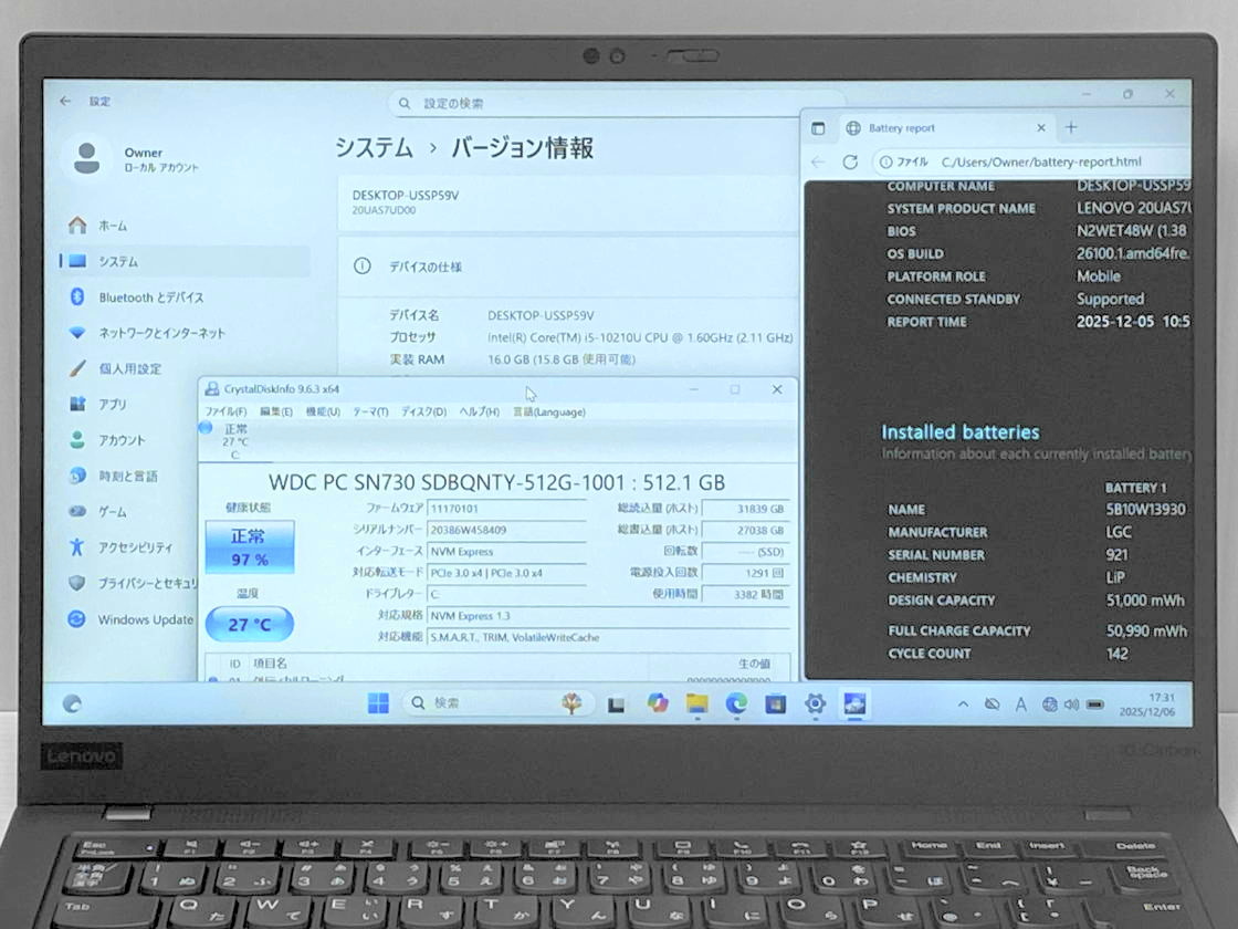 バッテリ充電可 OS表示値5時間28分~10時間02分 下記バッテリレポートをご参照ください。
