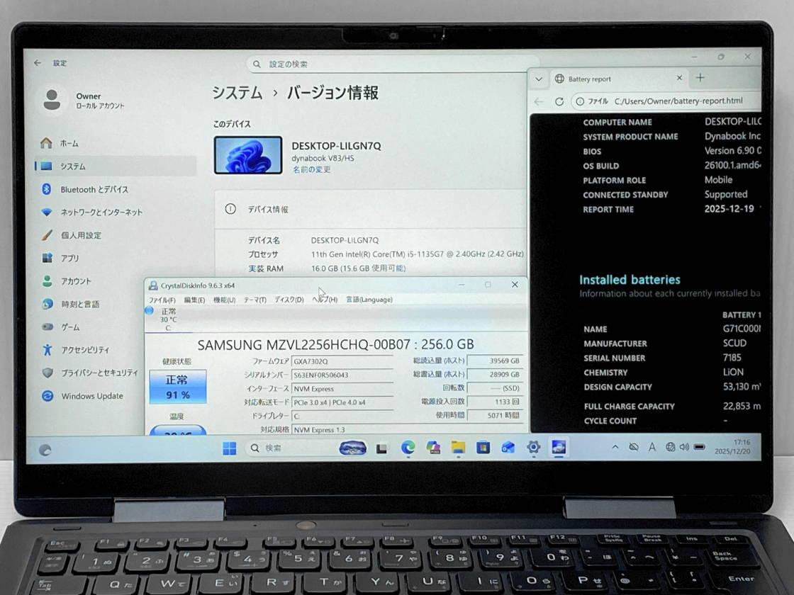 バッテリ充電可 OS残時間表示4時間14分~5時間46分 下記バッテリレポートをご参照ください。