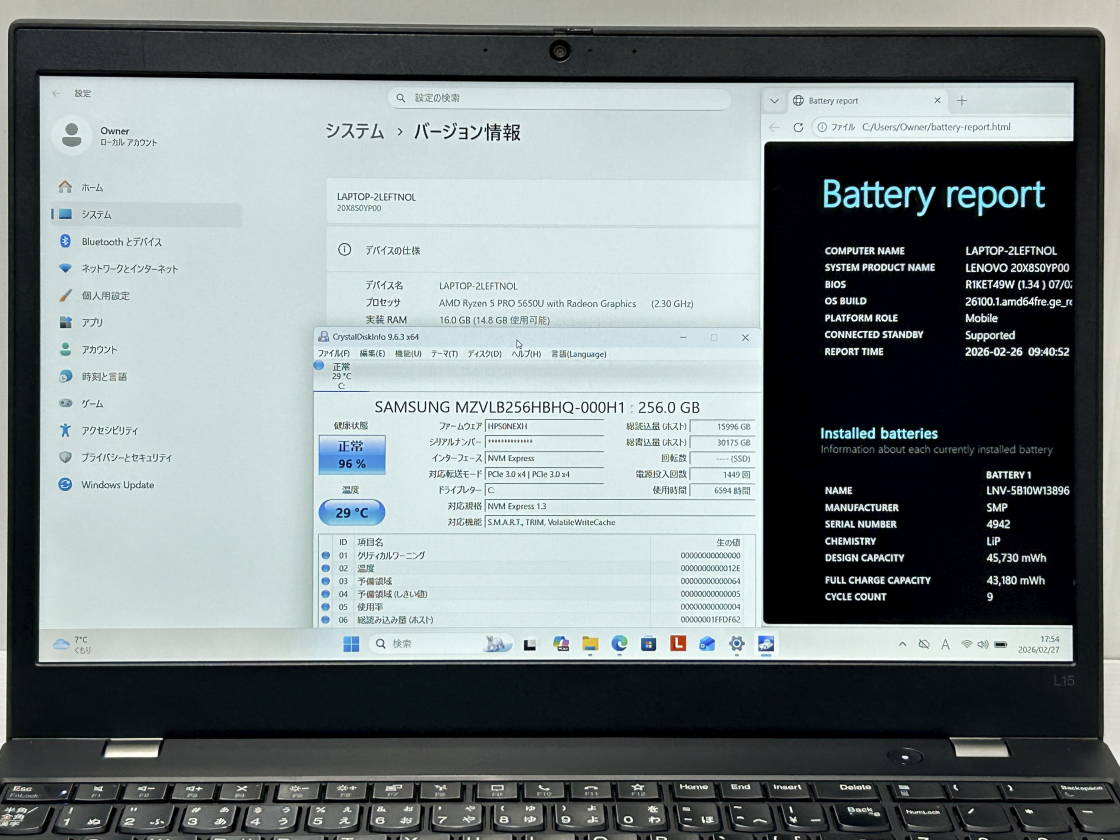 | OS | WINDOWS11Pro64bit リカバリ領域有 | 液晶サイズ | 15.6インチFullHD |