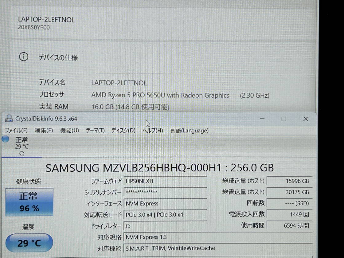 | CPU | AMD Ryzen 5 PRO 5650U 2.3GHz | メモリ | 16GB |