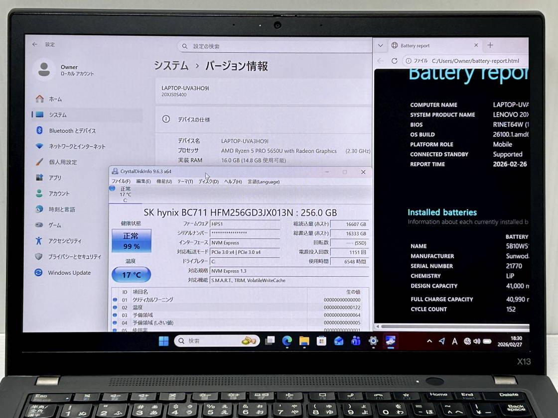 バッテリ充電可 OS表示値3時間30分~11時間31分 下記バッテリレポートをご参照ください。