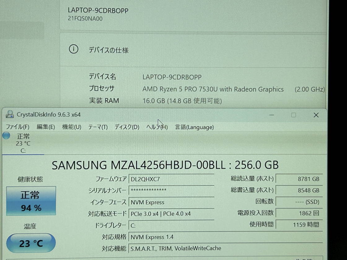 | CPU | AMD Ryzen5 Pro 7530U 2.0GHz | メモリ | 16GB |