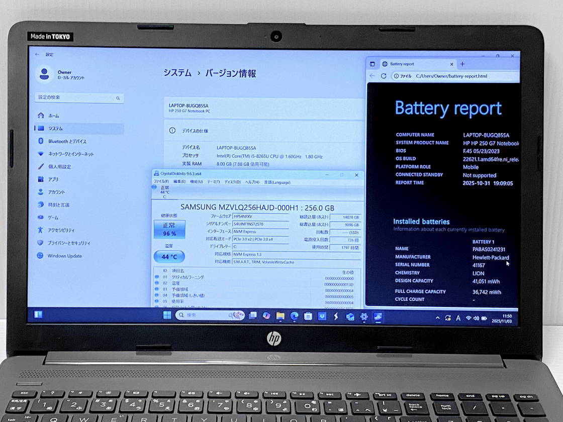 バッテリ充電可 OS表示値なし Windows battery report 36742/41051mWh