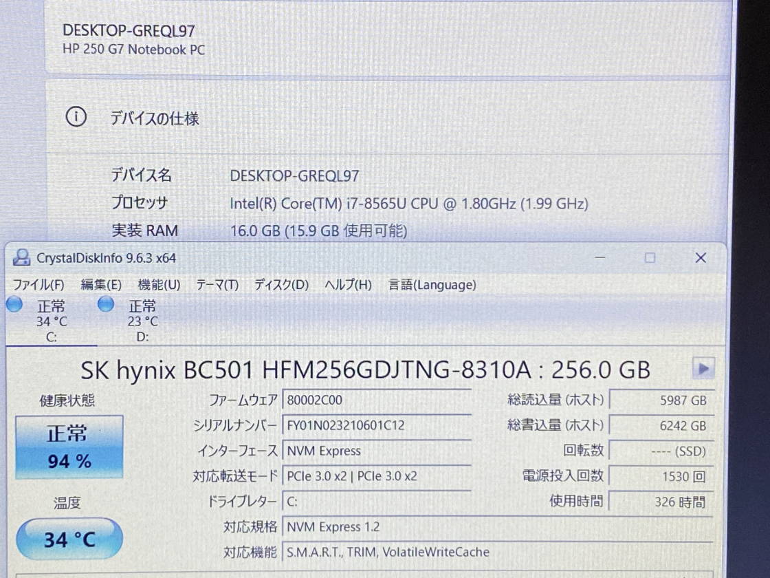 第8世代Core i5 HP 250 G7 Core i7 8565U 1.8GHz/16GB/NVMe256GB+HDD500GB DVDスーパーマルチ/WiFi/15.6FHD/WebCam/WIN11