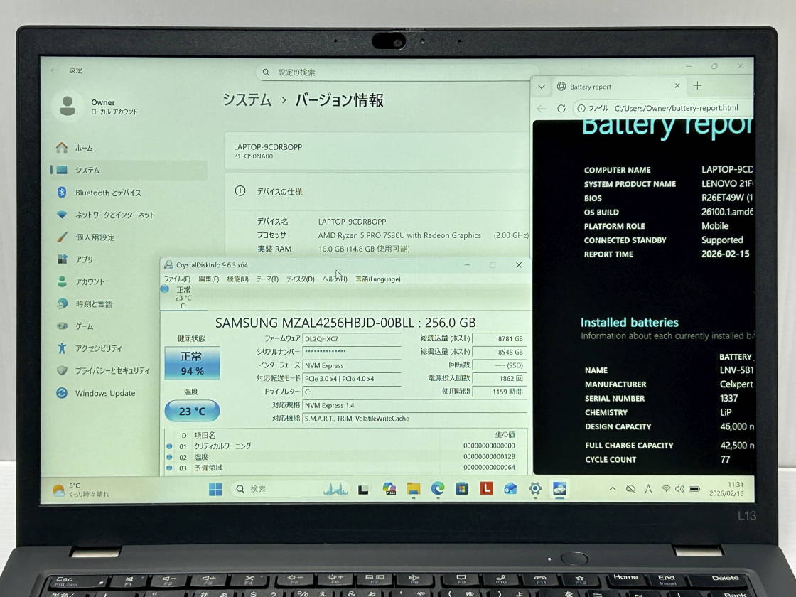 | CPU | AMD Ryzen5 Pro 7530U 2.0GHz | メモリ | 16GB |